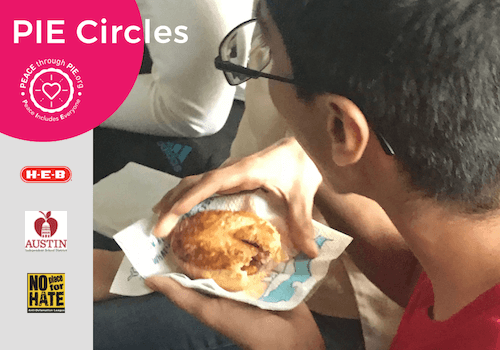 With the help of Chef Adam Phillips (head of the Travis Culinary department), students became professional caterers and learned how to develop, bake and package 1,400 hand-held Peace Pies that were distributed to each student in the circles. The materials for this program was made possible through a direct HEB donation that was secured through Peace through PIE's Peace Partner Catalyst Program.
